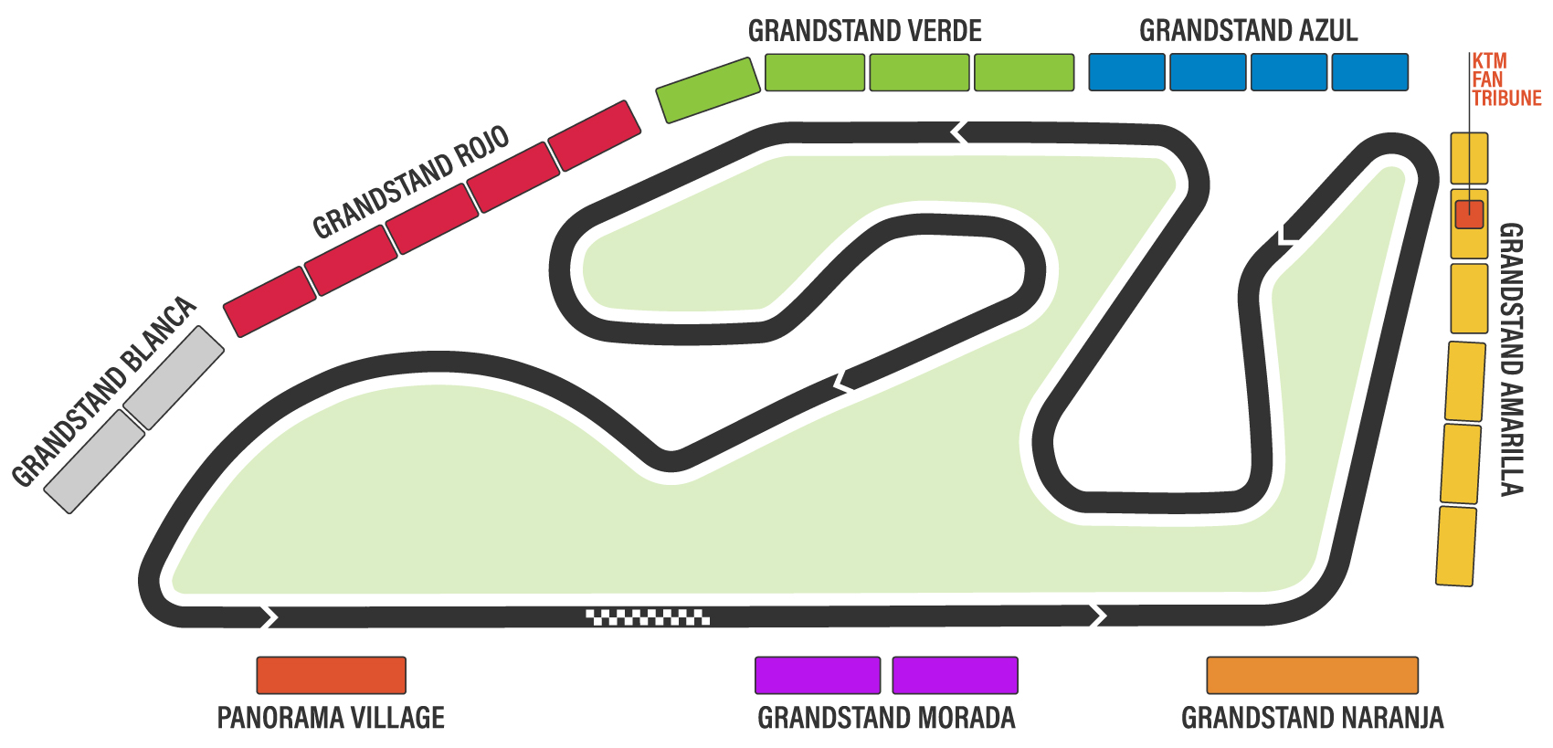 La maggior parte dei posti a sedere sulla tribuna arancione, nota come Tribuna Naranja, si trova proprio accanto alla cima della curva 1, che è collocata alla vostra sinistra. La maggior parte dei posti a sedere si trova a sinistra di questa tribuna, mentre a destra si trova l'enorme complesso della Tribuna Gialla.